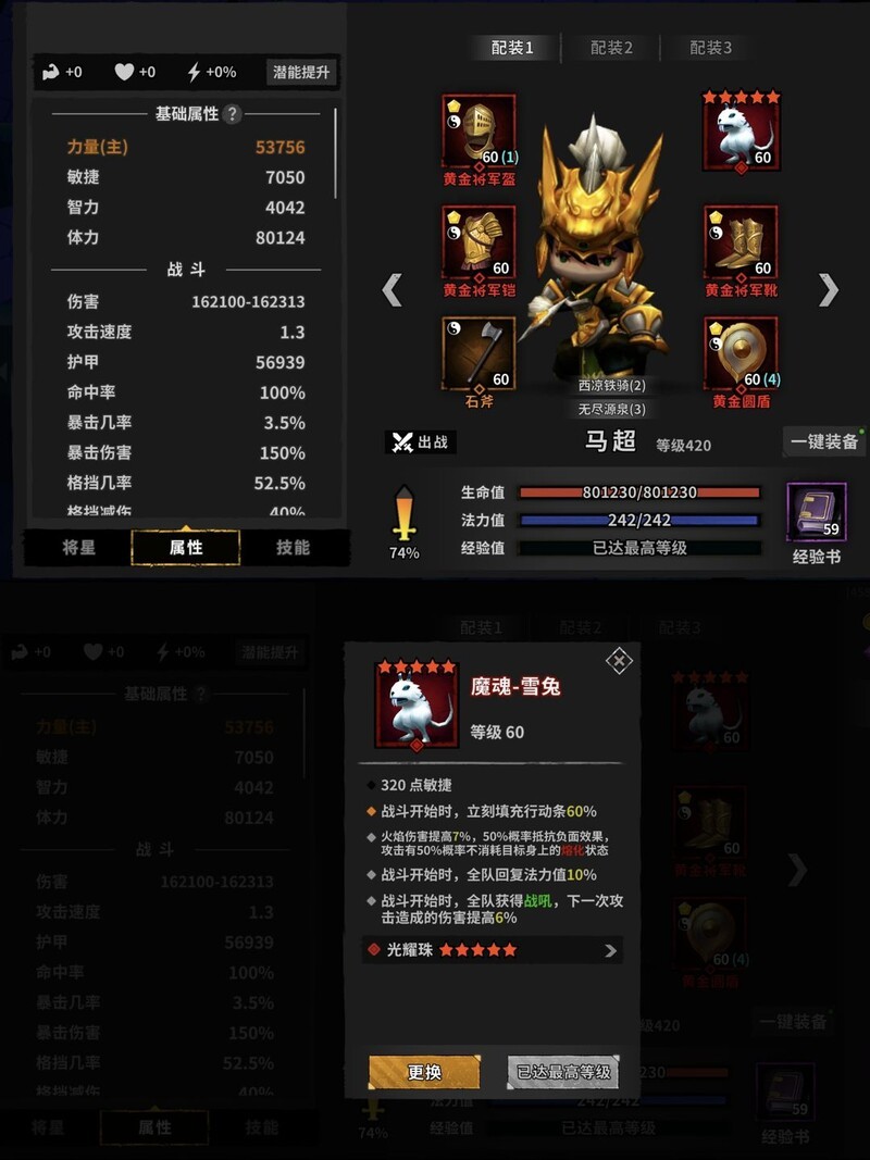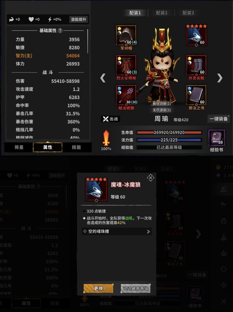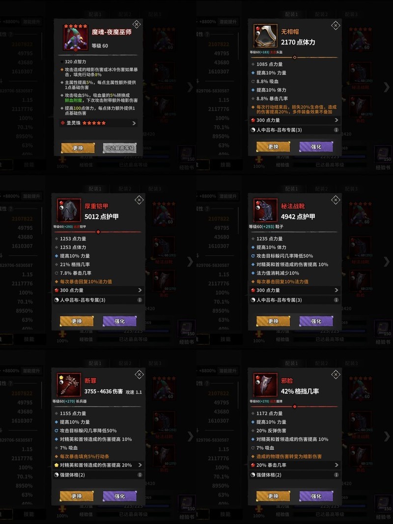 因为主将选择问题,我凑了30%暴击率,吕布比较缺乏精英伤害,所以红装就能成型。我随便搭配了力量、百分比力量、精英、暴击和暗伤属性。根据测试,这套搭配打黄忠时基本打六下对方才会动一次。吕布对操作有一定要求,大家根据自身情况决定是否尝试。另外要注意的是,必须在0.36秒内解决怪物,否则它会反击,毕竟吕布没有控制效果。