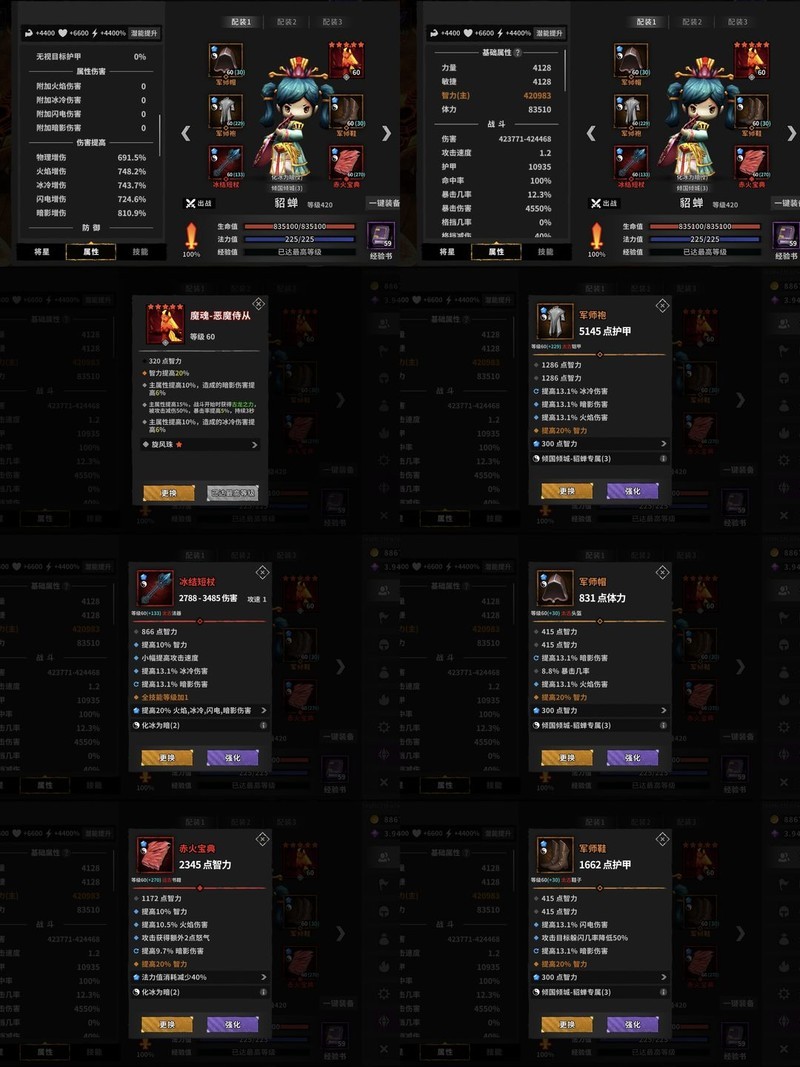 装备选择主双智力属性,搭配电伤与暗伤效果。
