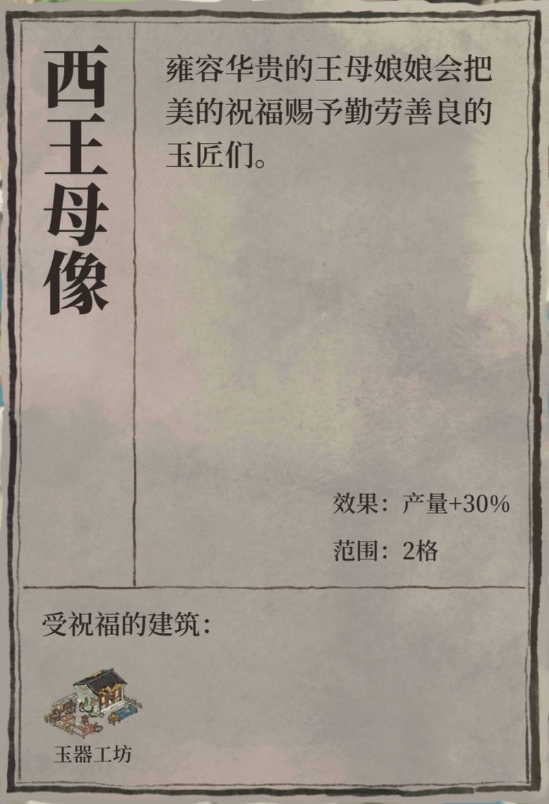 扬州府内拥有文昌阁与钞关两处奇观,城墙有九处待修,设有两座特殊加成雕像:西王母像可使周边两格内的玉器工坊产量提升三成,千秋灵漆像则令周围三格的漆树林、漆器与螺钿作坊增产三成,另配有码头、驿站及漕运码头各一。