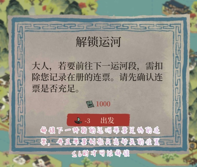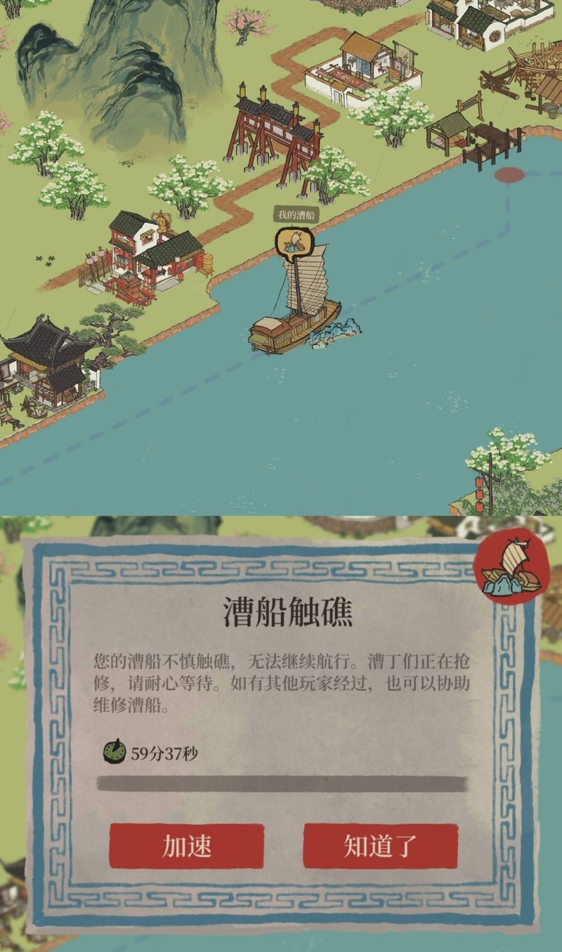 漕船航行时可能触礁,需使用加速票或等待一小时才能继续前行;修复后停留在原地,本次剩余的通航步数将作废。