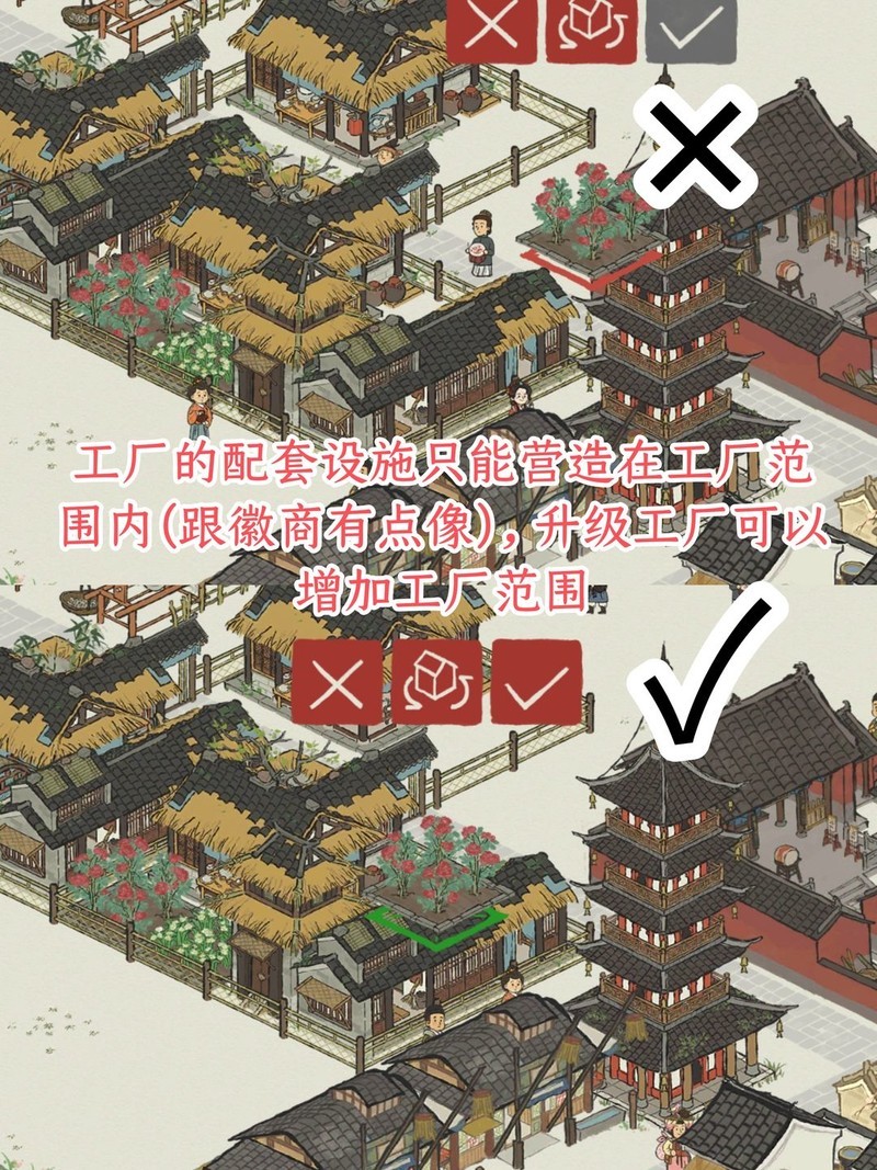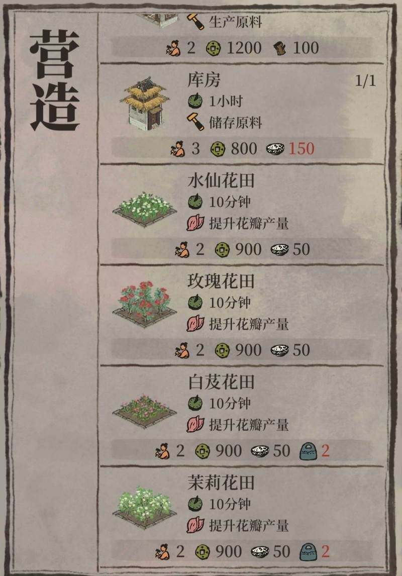 建设员工宿舍,自主决定建造仓库或花田以生产花瓣;若为印刷厂,则选择搭建雕版棚来制作年历或经书。