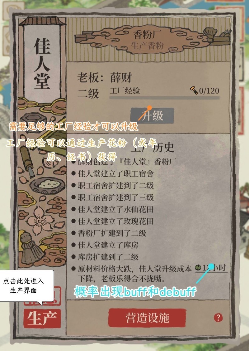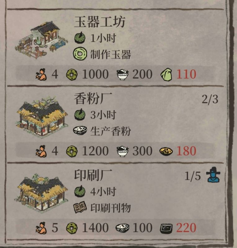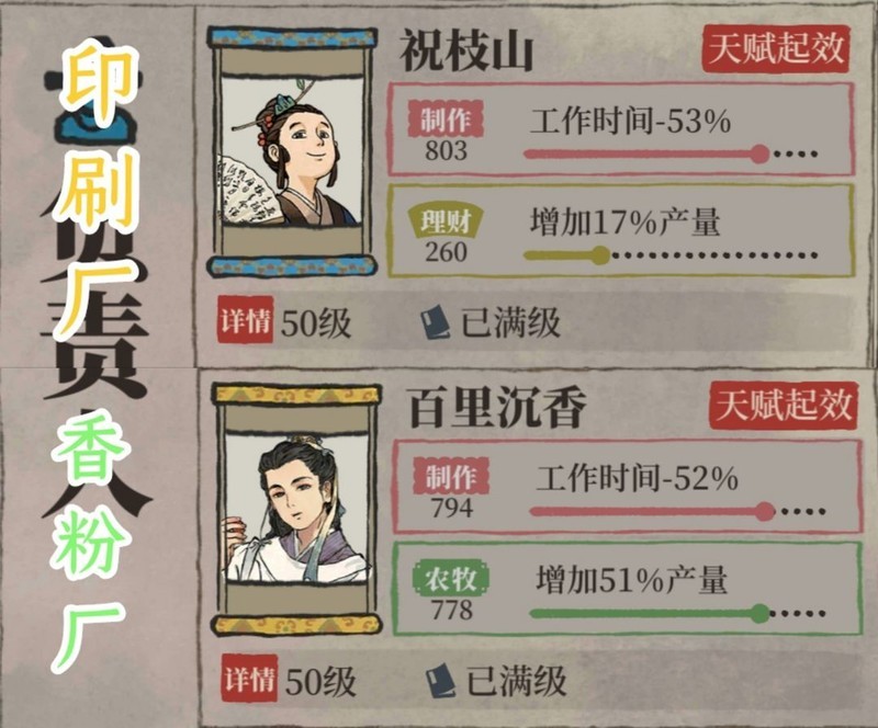 在香粉厂,特殊人物的制作属性可缩短工时,农牧属性提升产量;在印刷厂,制作属性同样减少耗时,理财属性则能提高产出。