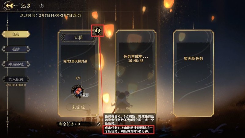 点击任务右上角的重置按钮,可刷新如每日难题这类复杂任务。每5分钟即可刷新一次,可放心操作。建议优先选择容易完成的任务进行刷新。