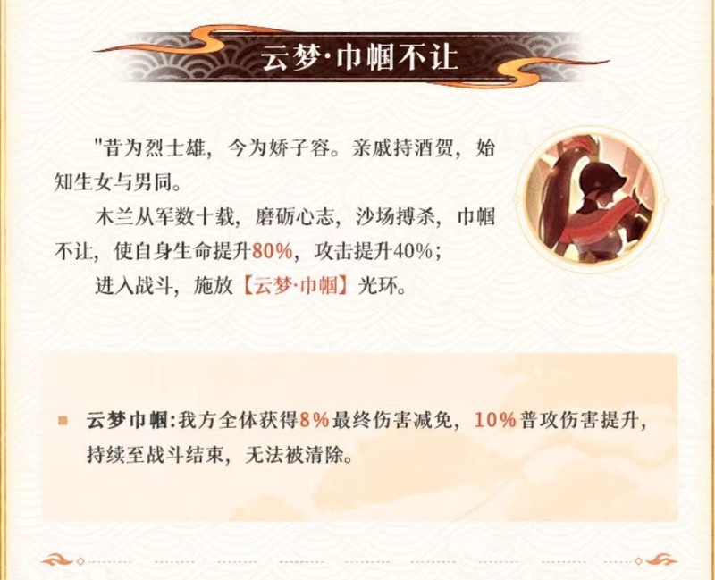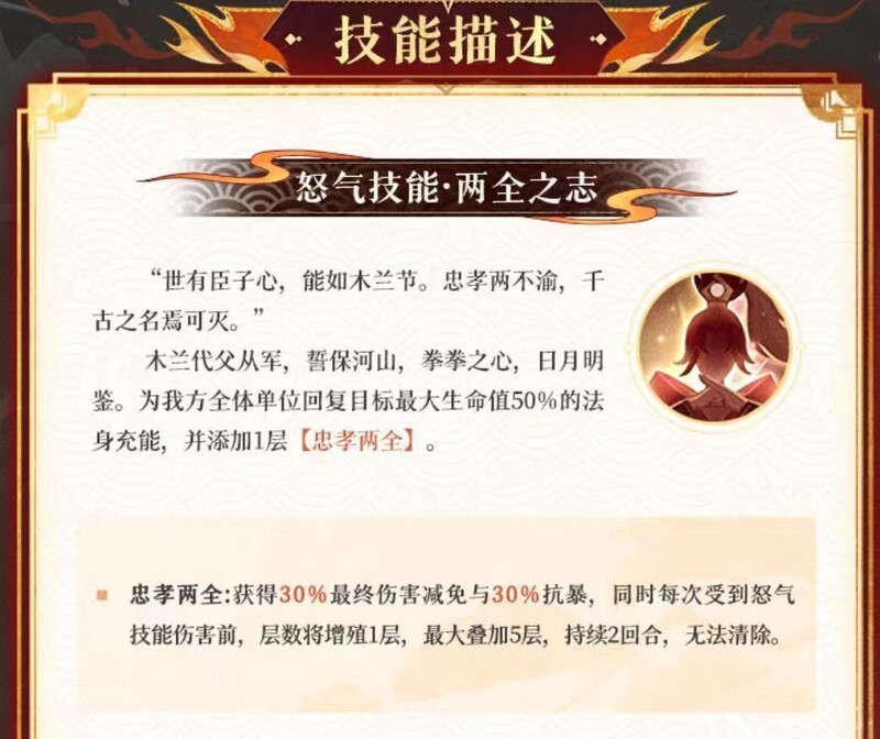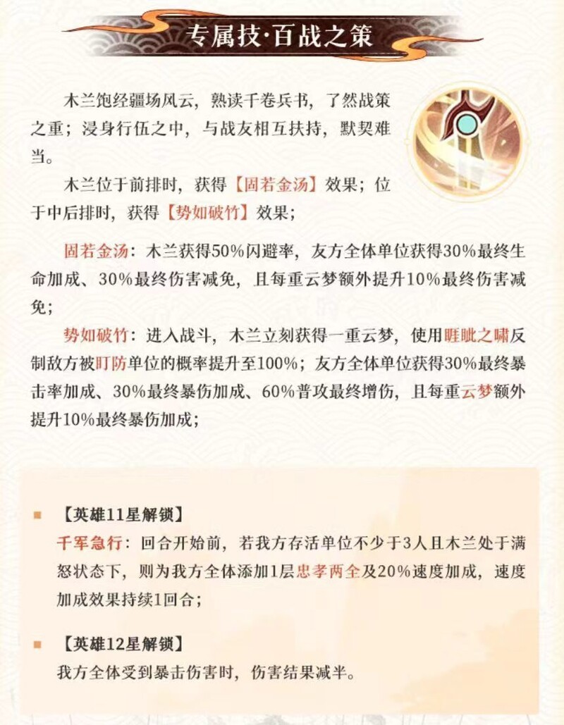 第三技能百战之策的效果会依据木兰所处的位置发生变化。若置于前排,可获得50%的稳定闪避,甚至能躲避暗法的开场技能罪障;若置于中后排,则在战斗开始时自带1层云梦状态,并且二技能必定触发睚眦效果。因此,在站位选择上需要权衡利弊:前排能提高生存能力,但会减缓木兰叠加军威和云梦层数的速度;而中后排虽然提升了技能触发效率,但在面对高爆发敌人时可能较为脆弱。具体选择需根据实际战局判断。