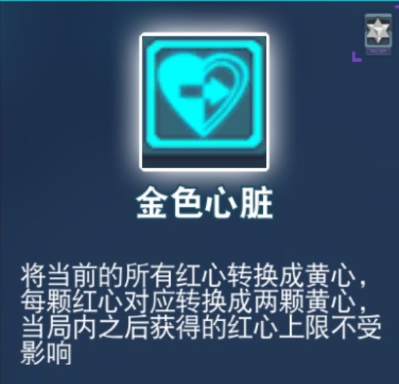 黄心流的核心机制相当于每有一颗黄心就能提升相应点数的上限,效果非常强势。有了这个机制后,保持黄心不再困难,同时还能将红心压到很低,通常只需保留2-3颗红心即可,多余的红心可以用来在维罗妮卡处换取道具。当黄心较多时,可搭配摩羯座圣衣、宇宙牌香烟等装备发挥更强效果;红心较少时,又能与占士被动、万德弗尔被动、反应装甲等形成联动。这无疑是一件神器,从名字就能看出端倪。唯一的不足可能是进入试炼之地的难度会相应提高。
