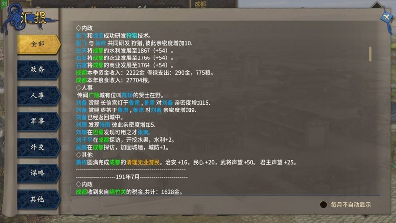 看看,士兵不少吧?怎么维持生计嘛,当然就是靠抢了。犍为那边一次能抢到8万粮食和3万铜钱,锦竹关也有5万粮食和1万铜钱。这时候千万别想着守城,毕竟麒麟儿还没出来做事,你那边人手不够。情报方面一定要用最高级别的。