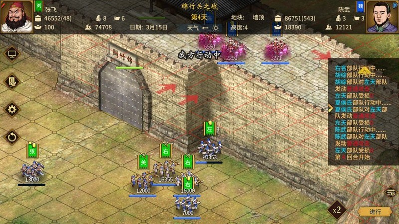 战斗中仅使用霹雳车(投石车)作为攻城器械。自创武将的技能选择霸王和火烧,此时能发挥关键作用。带上关羽,配置轻弓,最好是强弩。第一天至第二天进行布阵,关羽在第二天释放威震华夏,自创武将以无当弓释放火烧攻击城头,同时开启霸王技能造成伤害并吸引敌军注意,关羽紧接射击敌方主将,使其陷入混乱,随后集中火力进攻。十五天内必定攻下城池。战斗结束后所有部队撤离,切勿留守(因武将实力尚不足)。此后持续发展,等待15年后子嗣成年出仕。若担心控制不稳,可加入徐庶防止敌方主将解控,张飞的断喝与刘备的仁者无敌也是不错的选择。