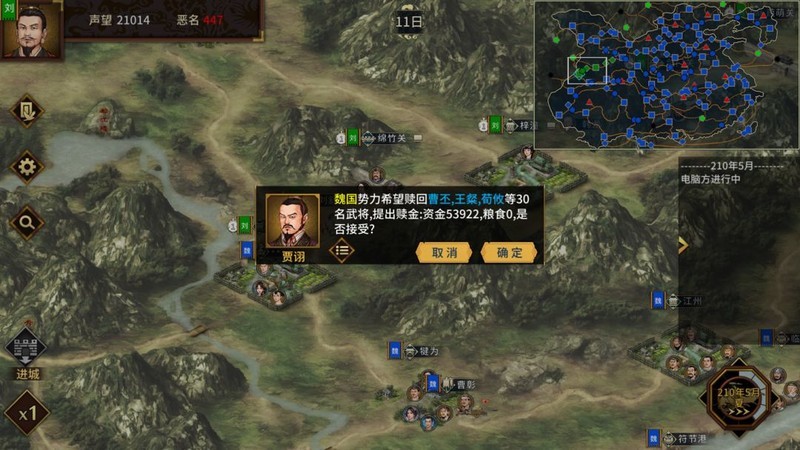 一旦决定行动,便无需再顾虑曹操的势力。优先选用刘备、徐庶、黄权、简雍等人,反复征召使用。在养兵阶段,可安排自建角色在谋略与笼络之间来回尝试。对于俘虏,采取杀一放五策略:杀一人增加50恶名,放五人减少50恶名,借此平衡声望。随着敌方人数逐渐减少,战斗将更加顺利,每次攻城时都能俘获大量人才。