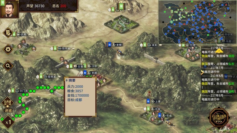 206年后进行布局,以关口和犍为为扩展方向,依次攻取江州、梓潼、越隽(确保三城城防低于2000),采取打完即撤策略,不必留恋。记得带上麒麟儿们一同参战,提升功绩,同时为他们配备第二支队伍,方便后期占领城池与建立根据地。