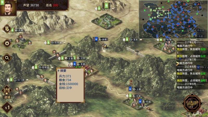 接下来就是老样子,一座城池关口节点由六位两万元帅率领十二万守军驻守,AI指挥再笨也能攻下。预计耗时游戏时间五十年左右,祝大家最终都能成为猛将新星。