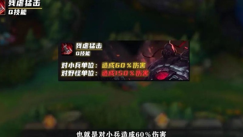 Q(1)技能对野怪造成150%伤害,对小兵造成60%伤害,蓄满后伤害极高,清野清兵效率极快。