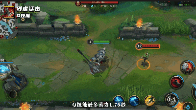 蓄力最长可达1.75秒,当蓄力超过0.75秒(约半条进度)时释放,可击飞并眩晕敌人。Q(1)技能的射程、伤害及控制时长均随蓄力时间增加,最长可使敌人眩晕2.25秒。