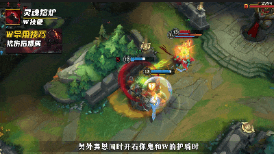 R(4)技能可对防御塔造成伤害,撞塔时可先释放W(2),利用W与大招的范围伤害清理路径上的小兵,加快兵线推进速度,迅速将兵线带到塔下位置。
