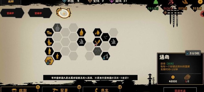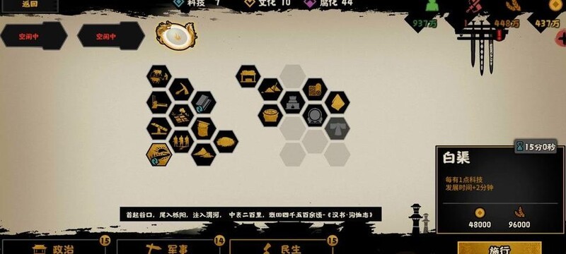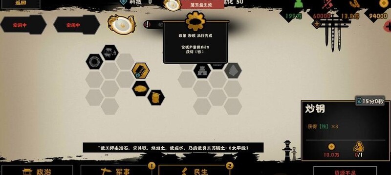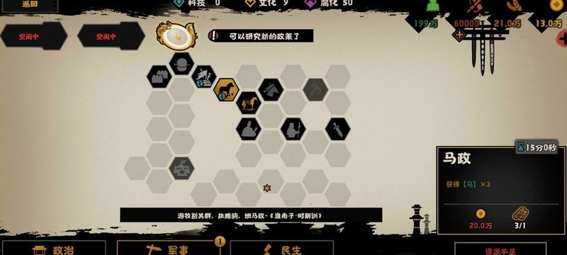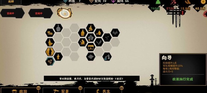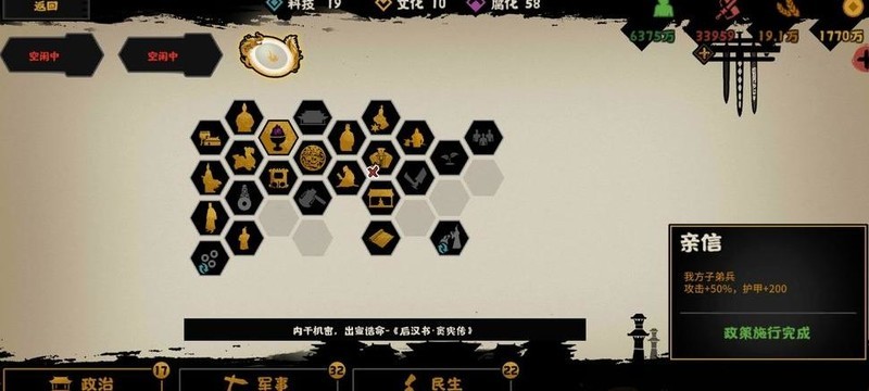 民生栏最右侧三项政策可解锁丝绸,孔子则能提供三名工匠。