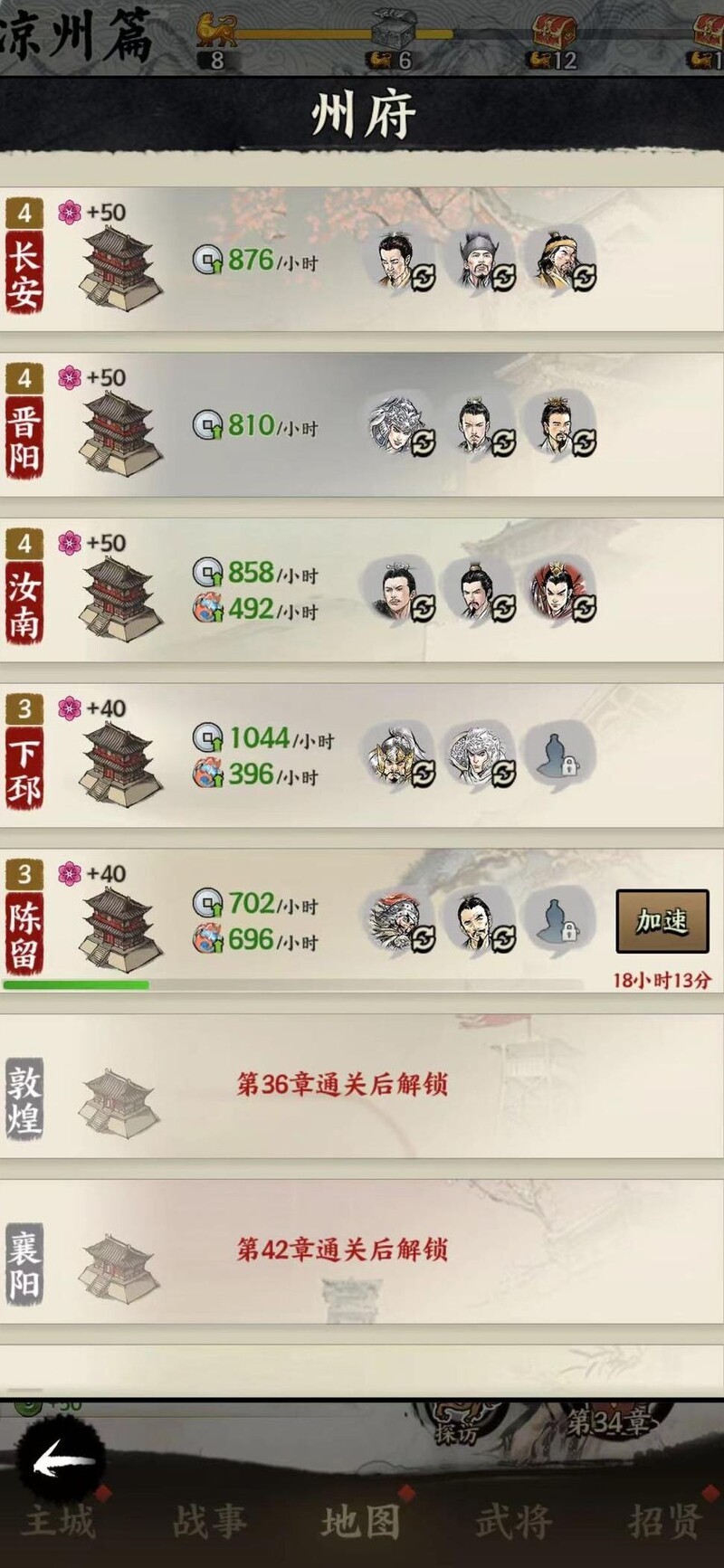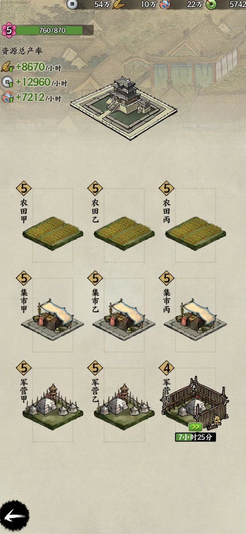 农田产粮草,集市出铢钱,军营收兵魂,资源优先升级粮草以保发展。