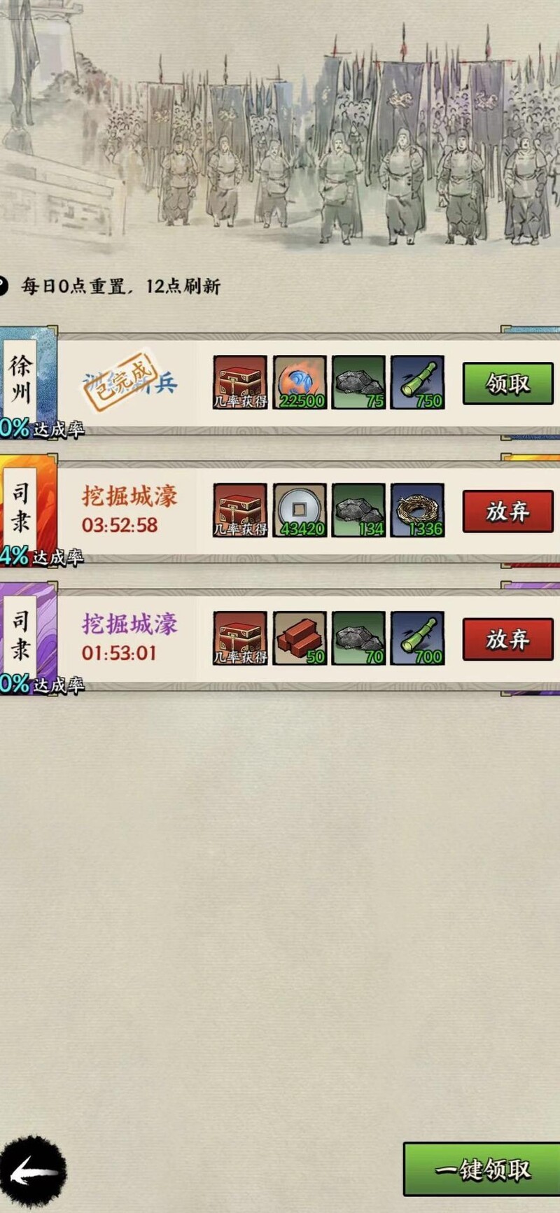 派遣武将领取奖励时,注意只有蓝色及以上品质的任务才会产出政务宝箱。参与周瑜活动需开启一定数量的宝箱,因此优先接取蓝色及以上任务。白色和绿色任务可等到中午12点新任务刷新后再统一处理,以便节省玉符,提高资源利用效率。
