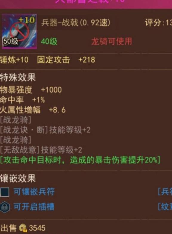 龙骑篇中,战龙推荐使用大都督战戟与孤月龙魂,影龙则搭配大都督战戟和霸王瞋雷枪。虽装备价格较高,最低也要百余万,但性能极为强悍,实战表现优异,具体效果见下图展示。