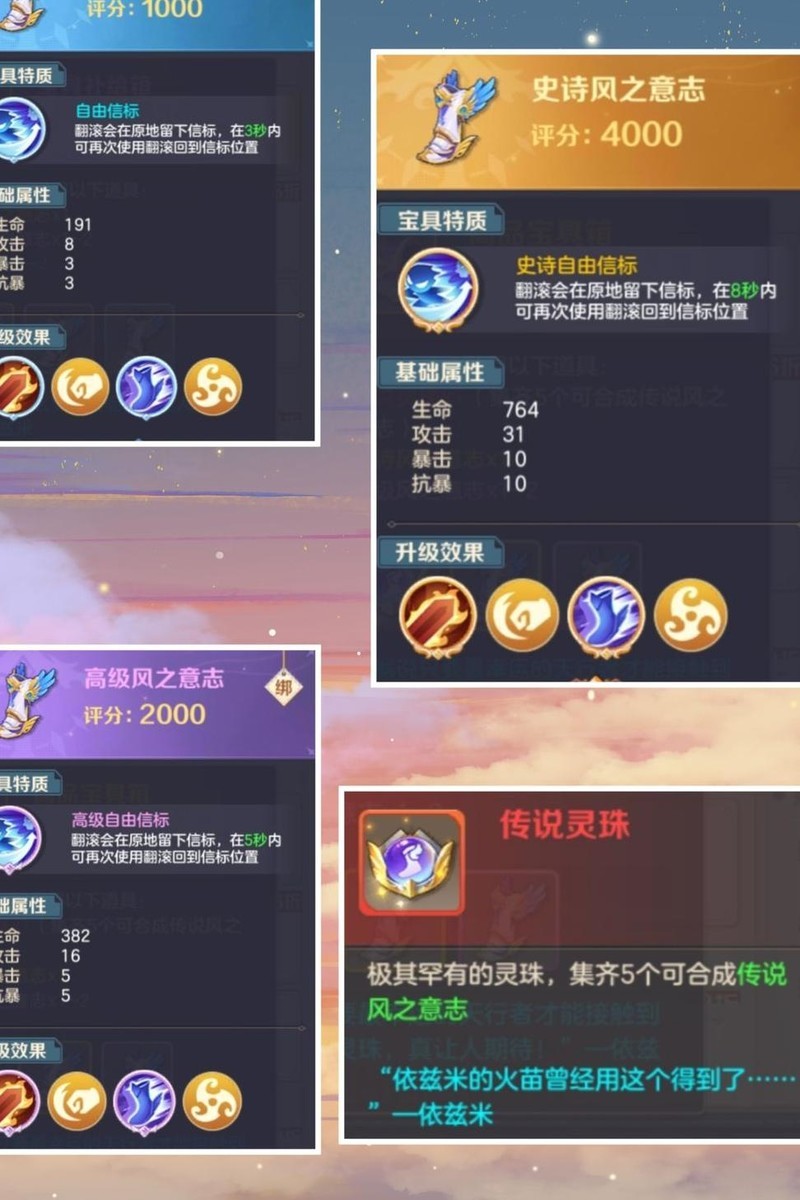 风之意志分为四个等级,由低至高为绿、紫、橙、红。绿色、紫色与橙色可直接生成成品,红色则需融合五颗传说灵珠方可合成。