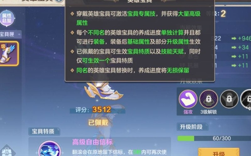每位英雄的宝具培养进度独立计算,均可装备,装备后其基础属性及部分升级属性将生效。