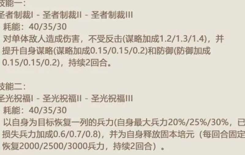 该技能实际效果为(以六星为例):单体治疗量等于最大兵力的30%加上损失兵力的80%,并使自身获得持续两回合的持续治疗效果。