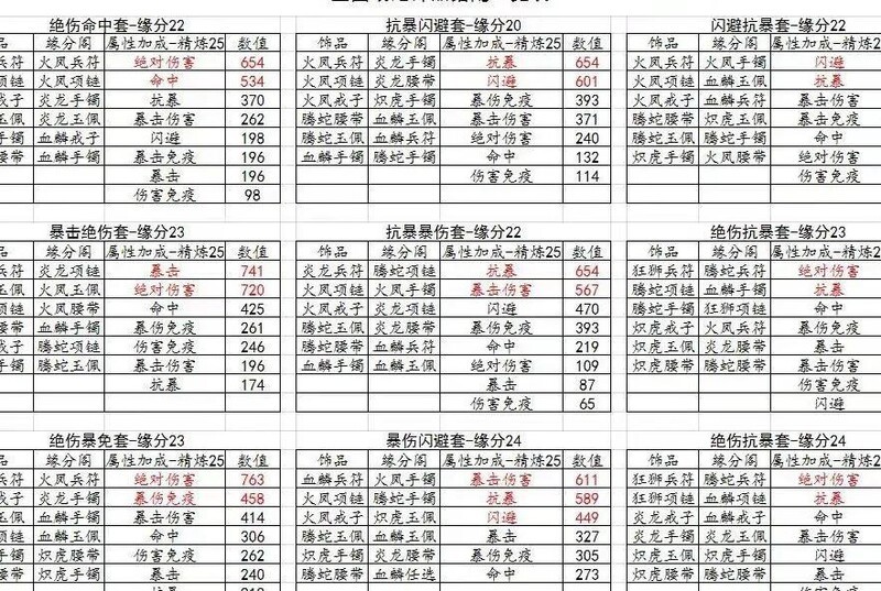 此阶段建议优先选择全套橙色饰品,或以橙色为主搭配部分金色饰品。由于资源积累较慢,多数玩家以精炼+25为常用配置,推荐以下组合方案。