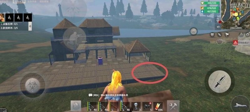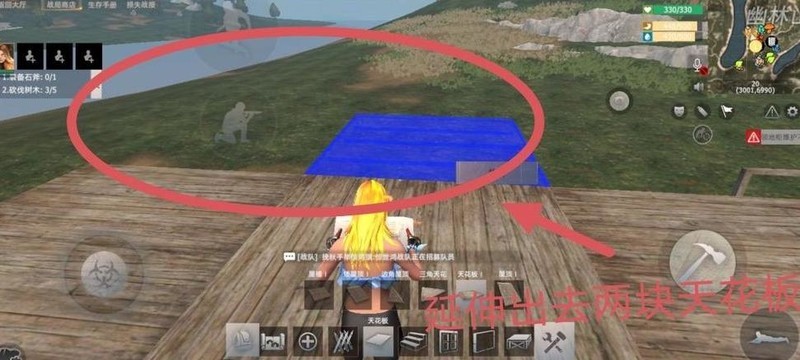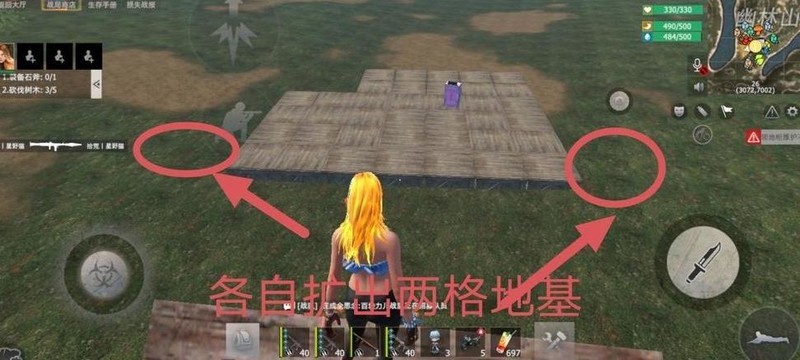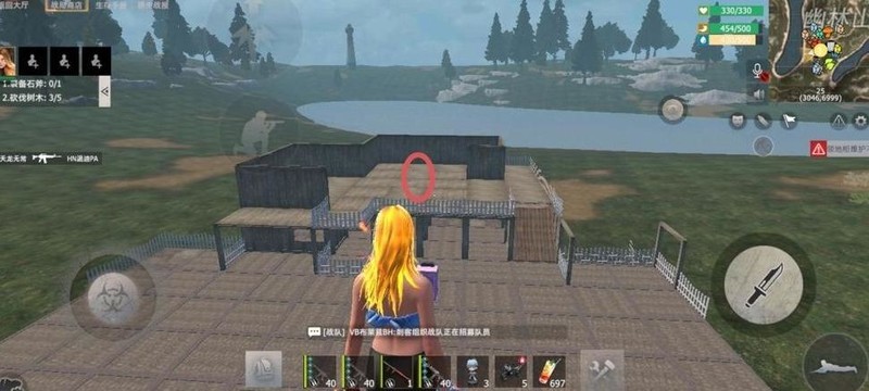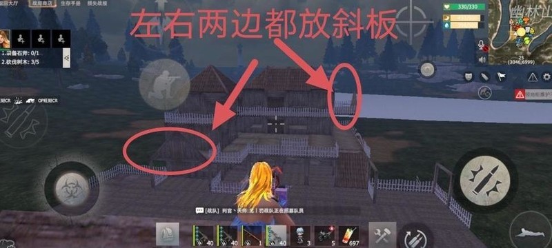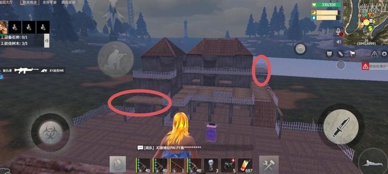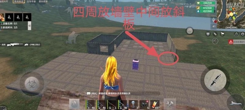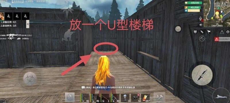 在下图圆圈位置四周建造围墙,中央设置通往二楼的斜坡。
