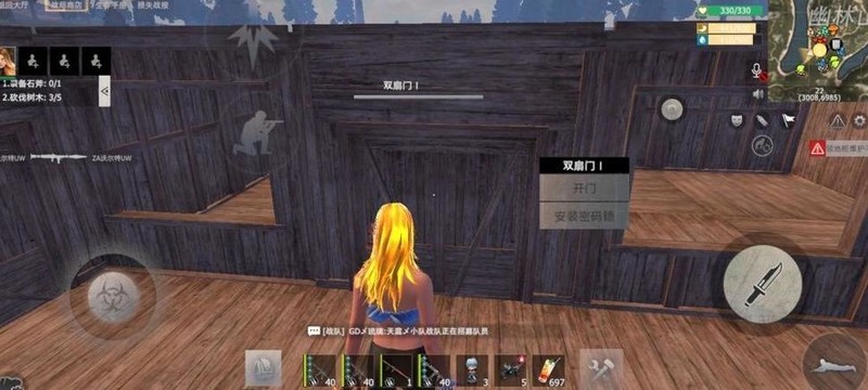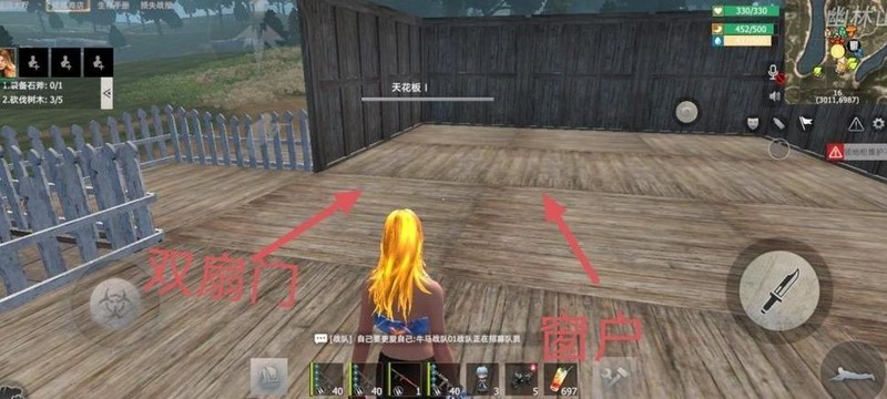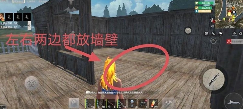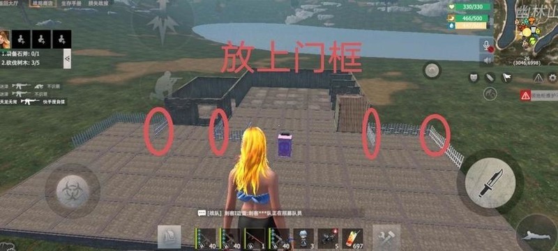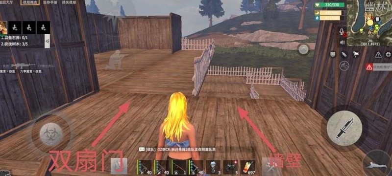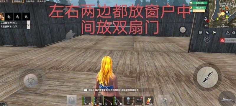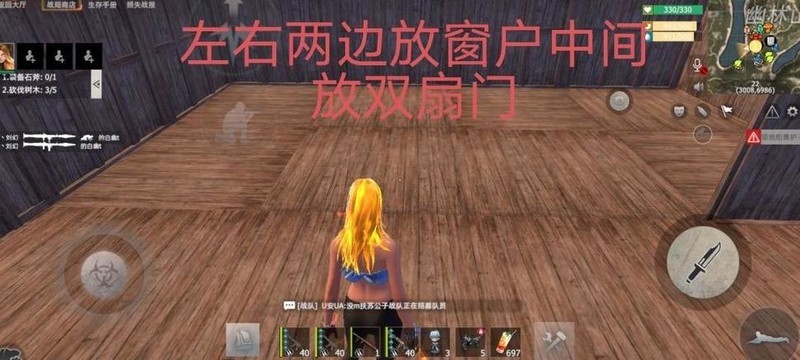 放置完墙壁后,请大家移步至图中圆圈位置,在左侧安装一扇双开门,右侧装一扇窗户,具体布局详见下图。
