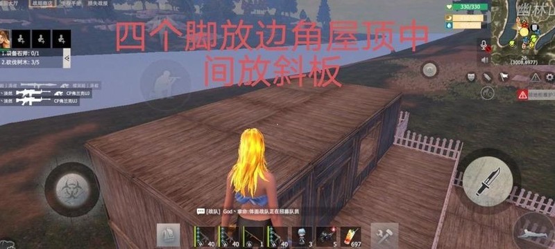 封好天花板后登上炮楼顶部,四角安装边角屋顶,整体结构即告完工。