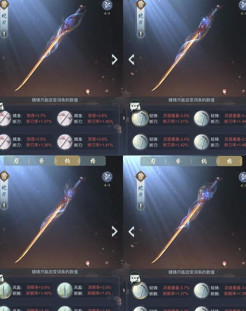 这三组词条源于结缘系统,其中状态属性抗性为12%,高于各项状态效果的6%基础值。因此,在选择状态属性时应更加集中,优先依据武器部位淬炼推荐的组合:8破刃与8折膝、8断腕与8断刃、8负伤与8反刃,这三组彼此无冲突。以往如一把剑同时洗出8破刃、4负伤、4反刃的做法,会导致后两者难以突破6%的抗性门槛,即便在结缘较低的情况下,分散属性也更容易被抗性大幅削弱。相较而言,属性集中能更有效发挥实际效用,提升资源利用效率,避免浪费投入。
