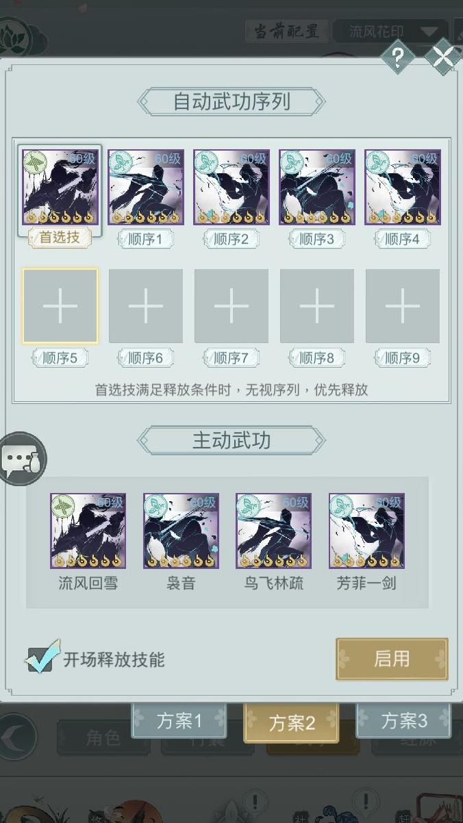 若擂台中对手痕迹较少,甚至可不释放技能,以无招胜有招。此时花印循环速度最快,但流风释放优先级偏低,暂不宜更换。15级缚龙及以上可尝试此打法,因其本身控制效果已相当强劲。