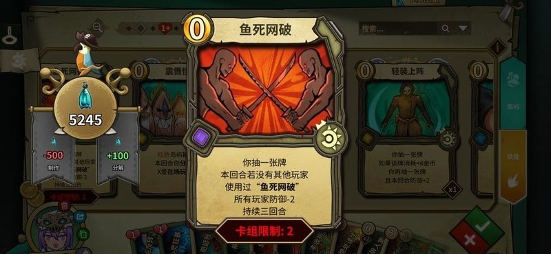 鱼死网破(两张):朴实卡牌,兼具双防与三回合效果,可过牌,配合提防用于红岛,绿岛则搭配福祸相依使用。