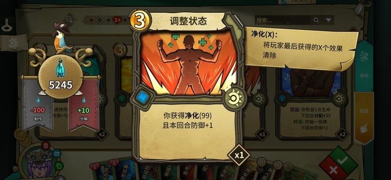调整状态(一张):净化效果,可清除负面状态并增加一层护甲,用于去除剑气及其他异常状态。