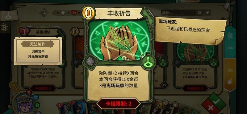 丰收仪式(两张):如同单刷赚钱卡,结束时还能触发开牌再刷下训的盾,用于消耗战。
