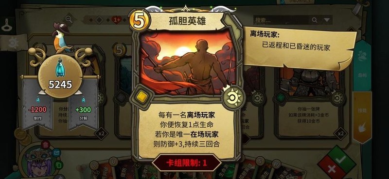 孤胆英雄(一张):单人作战卡牌,主打治疗续航,与丰收卡牌效果相辅相成。