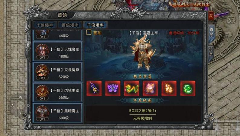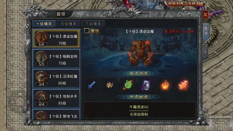 首领分十倍、百倍、千倍爆率,等级越高,掉落概率越大。