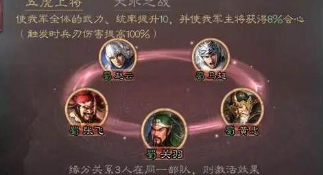 五虎上将缘分可使我方全体武力与统率提升10点,主将额外获得8%会心几率。该组合显著增强队伍整体攻防能力及主将爆发输出。赵云、关羽、张飞、马超中任选三人即可组成强力的3S级国家队,在享受属性加成的同时保留兵种适性优势,性价比极高。实战中常以赵云、关羽、张飞为核心搭配,兼顾输出、生存与协同作战能力,适用多种主流阵容体系。
