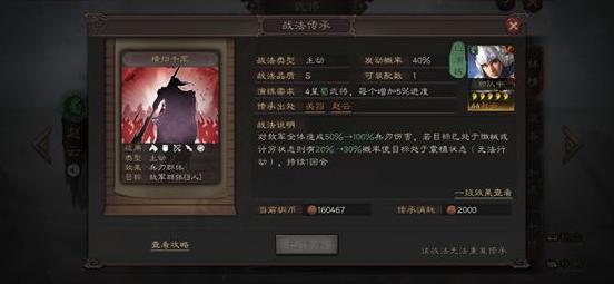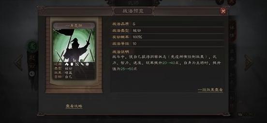 战斗中可使自身进入洞察状态,并提升武力、智力、速度与统率40点,若为主将则各项属性提升至50点。