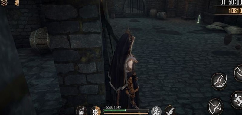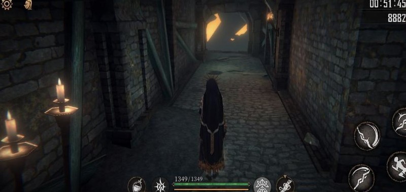 向左前行,遭遇三小怪与老太婆围攻,击败后拾取路中生命药水一瓶,直抵尽头攀爬梯子离去。