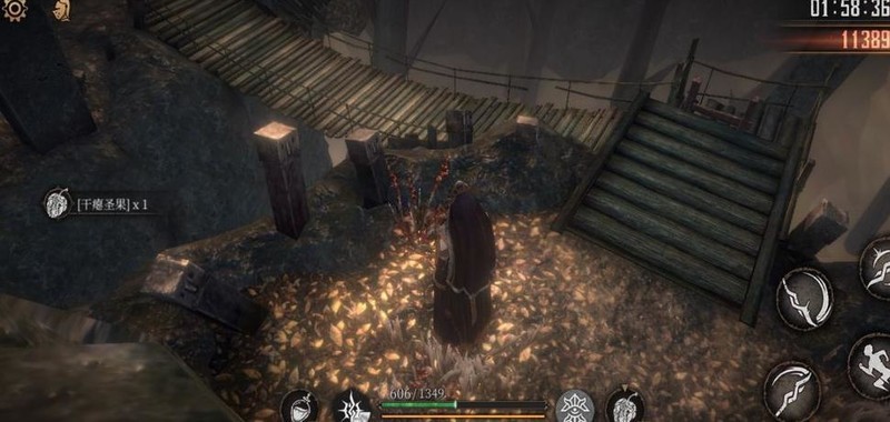 返回梯子处,击破老太婆获取干瘪圣果×1,随后直接跳下。
