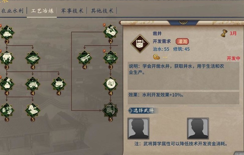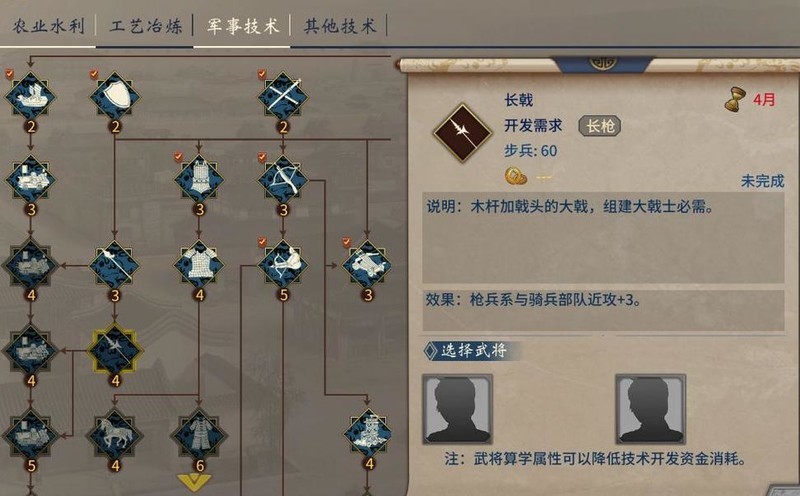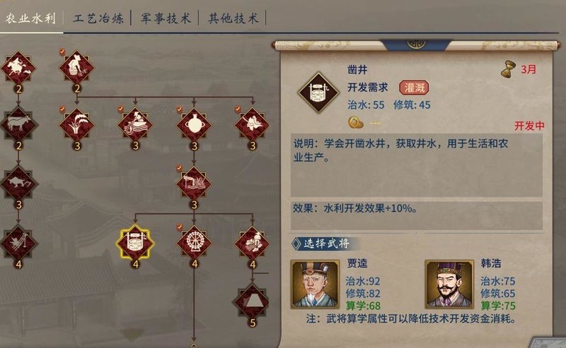 科技树涵盖农业水利、工艺冶炼、军事技术及其他领域四大分支。