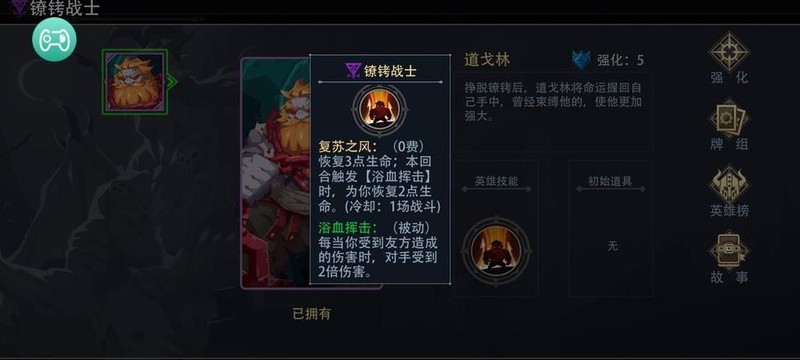 镣铐战士是暗系更新后唯一主打自残流的英雄,通过牺牲自身血量输出伤害。作为易获取的紫卡角色,其玩法新颖且强度出色,对生物等级依赖极低,6级升级可忽略,21级仅微幅提升回血能力,整体养成成本低,无需强力支援卡牌,非常适合新手使用初始卡组体验暗系玩法。