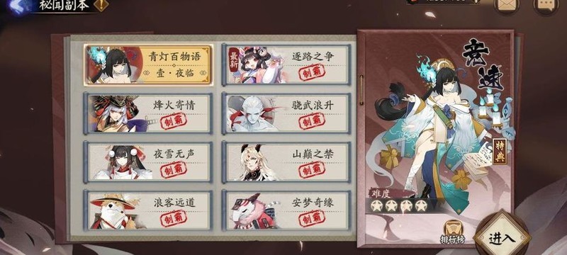 类似肉鸽机制的式神外传玩法,包含多种难度挑战。成功通关后可获得包括一个黑蛋、多张插画、一千二百勾玉及各类养成材料在内的丰厚成就奖励。