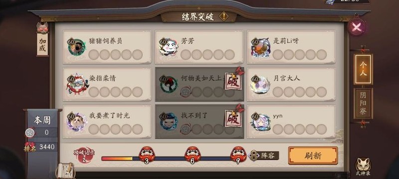 挑战结界需消耗结界券,失败则不扣除。结界突破的对手为其他阴阳师玩家,但由于机制偏向PVE,因此无斗技场中的减伤与伤害上限限制,实际输出与PVE环境基本一致。成功击破3、6、9个结界可分别领取对应阶段奖励,共计15勾玉。界面下方设有阴阳寮按钮,可切换至寮内结界突破模式,全员完成突破后还可获得寮资金奖励。