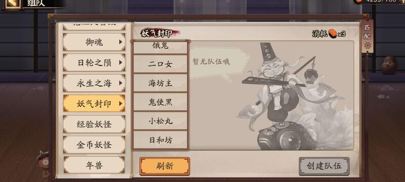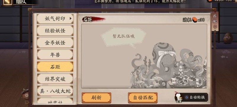 组队界面便于阴阳师快速组队,石距、年兽及妖气封印等活动通常需组队参与。前期体力有限,除任务需求外,建议暂不消耗体力于石距和年兽副本,合理分配资源更有利于初期发展。