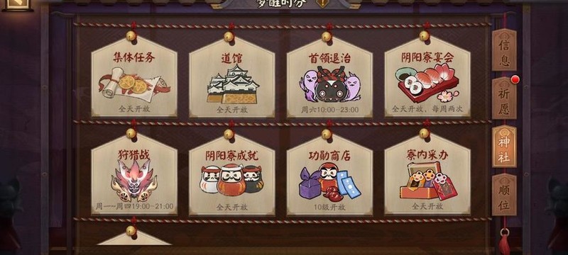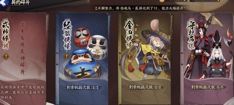 该副本坐落于地图中央,可挑战已解锁的式神碎片。每日两次刷新挑战机会,分别在凌晨0点与中午12点,刷新内容包含经验妖怪、金币妖怪及师徒任务所需的守护历练。