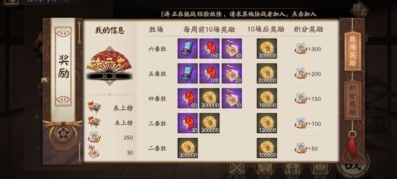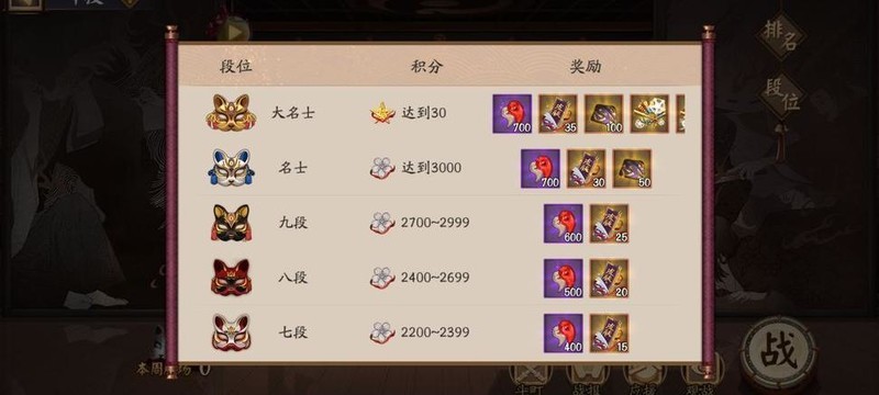 这里难度最高,高手众多,务必量力而行。每周赢得五场即可拿满奖励,包含三星风雷鼓、20个樱饼及一枚黑碎。