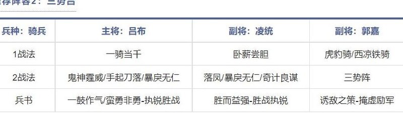 该阵容以吕布为核心,凌统的作用与吴骑中一致,依靠自身技能为输出武将提供先手攻击和伤害加成,但因其效果随机赋予单体,实际战斗中存在一定不确定性。