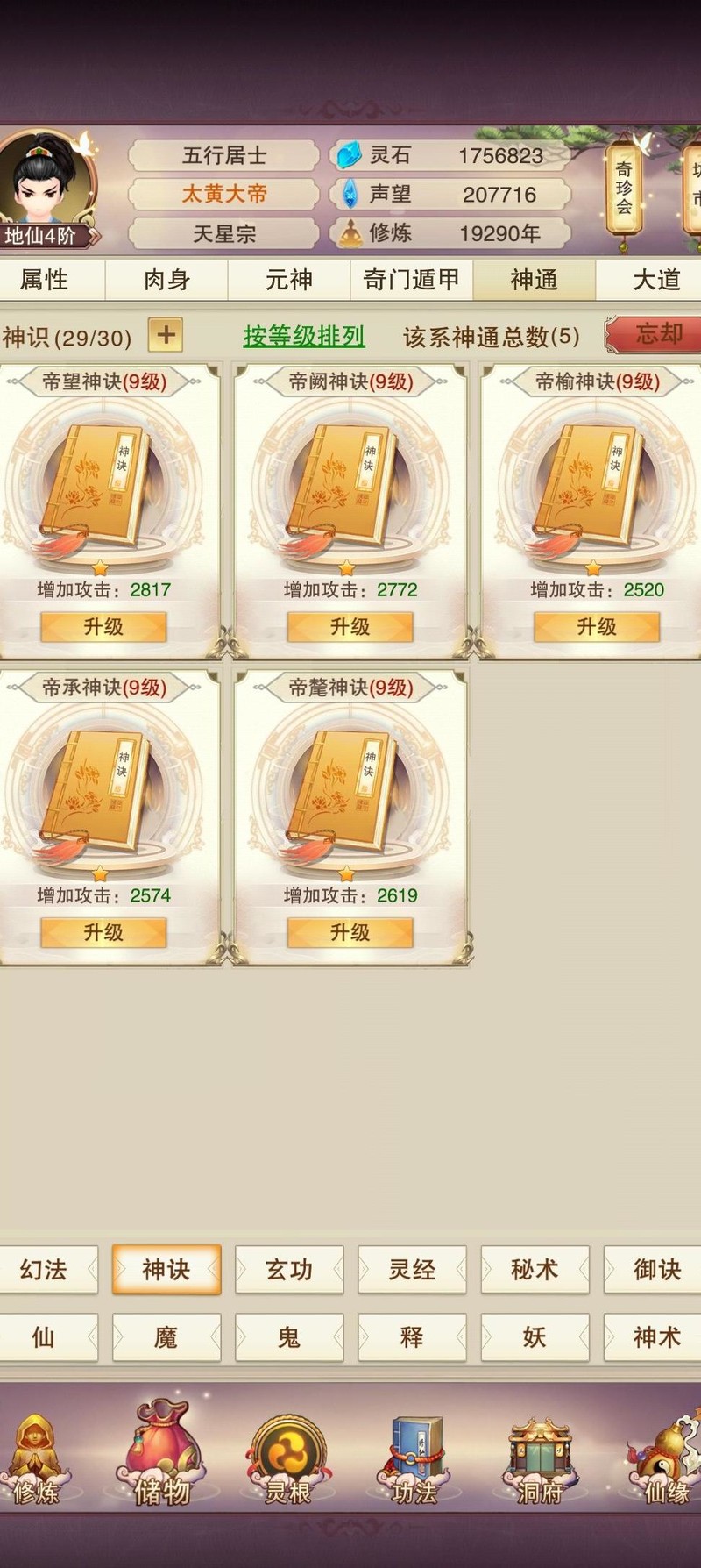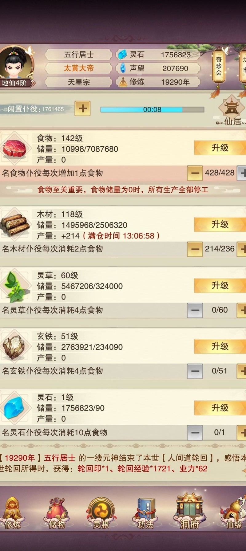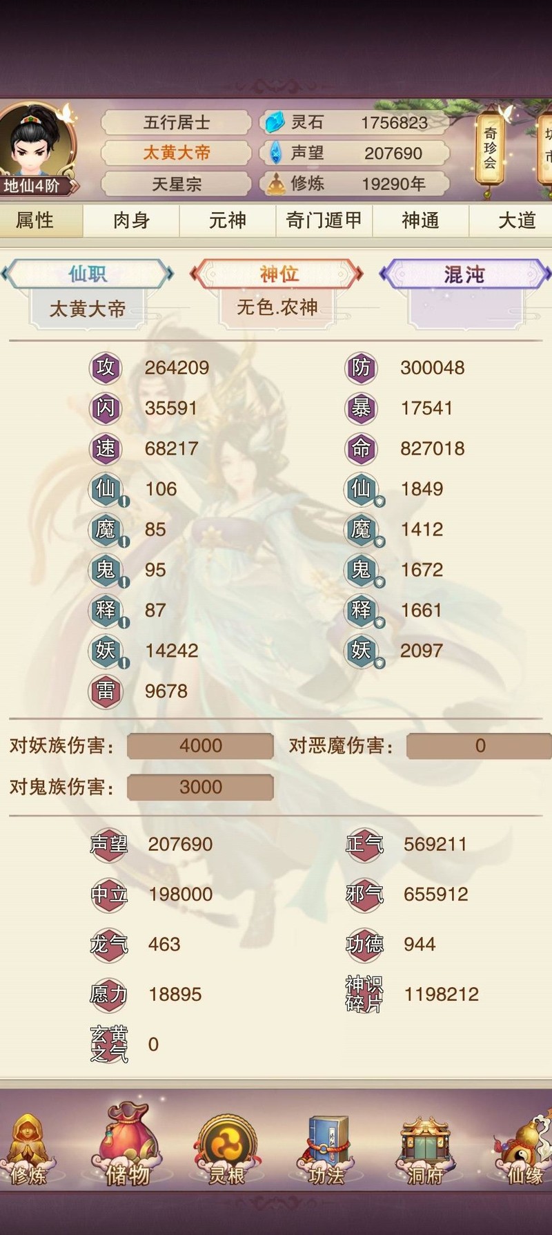 肉142,木118,草60,木51,洗髓130,聚灵242,此前为争夺天界之主曾提升数级。