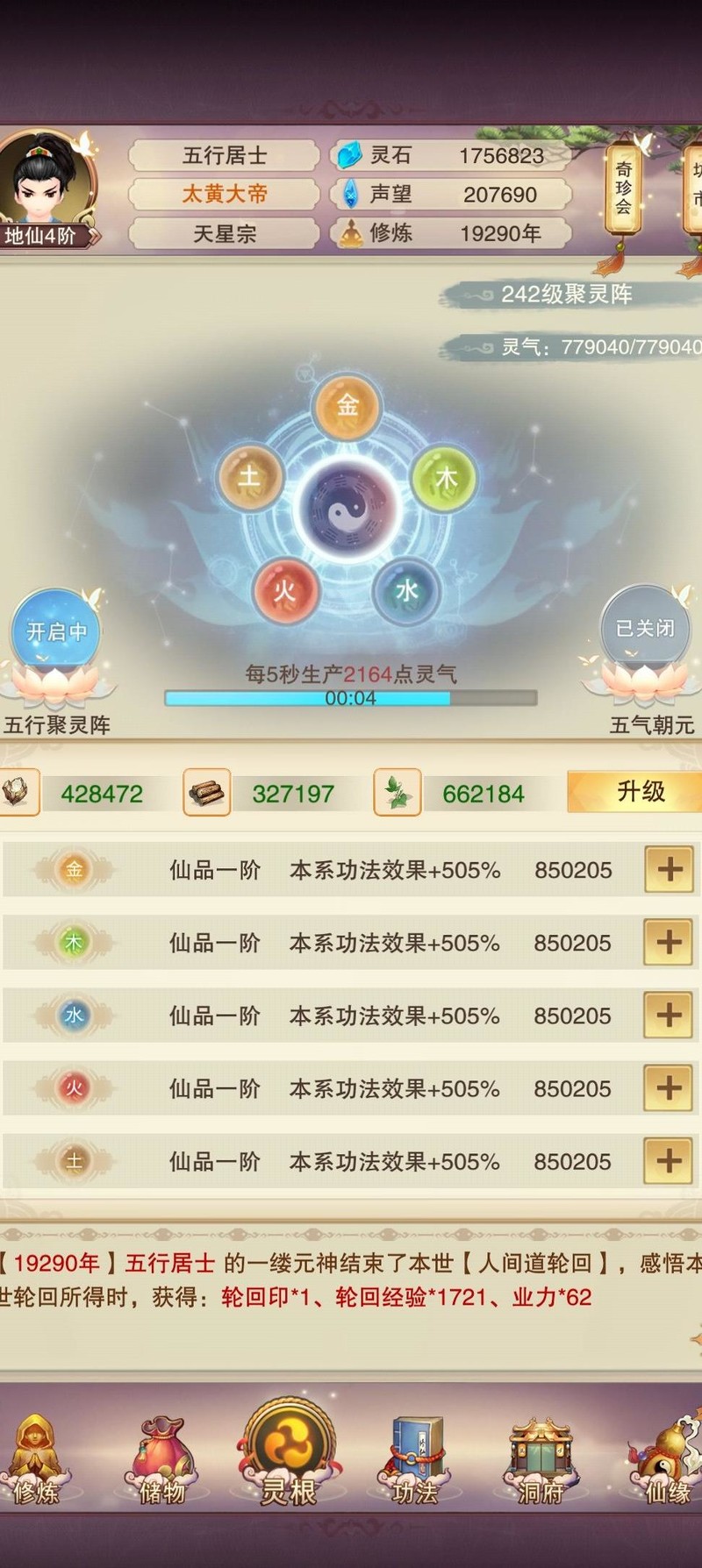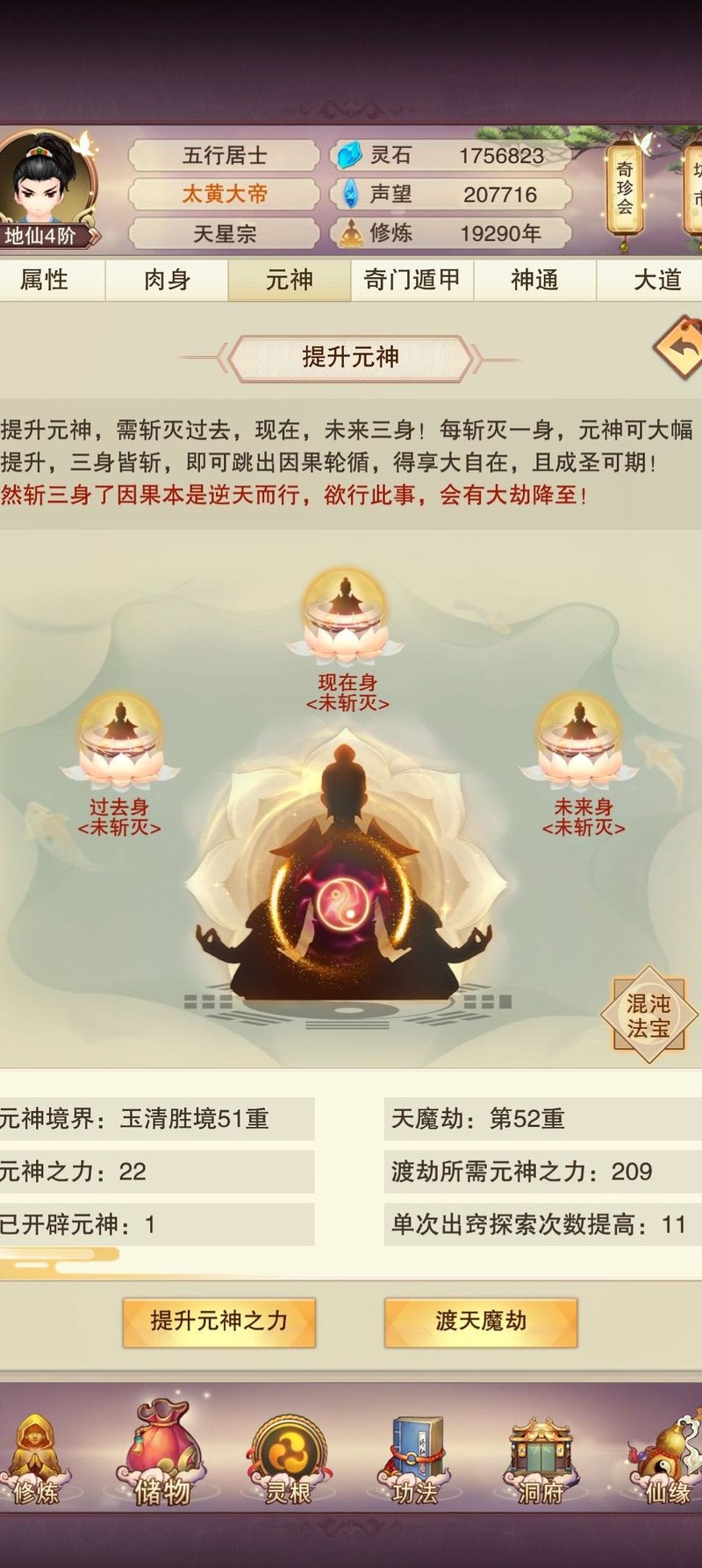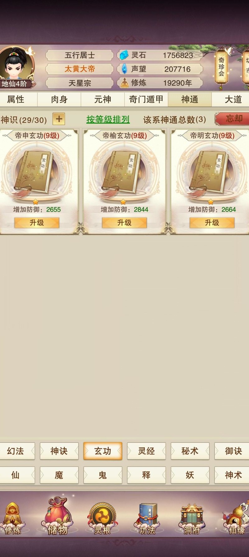肉142,木118,草60,木51,洗髓130,聚灵242,此前为争夺天界之主曾提升数级。