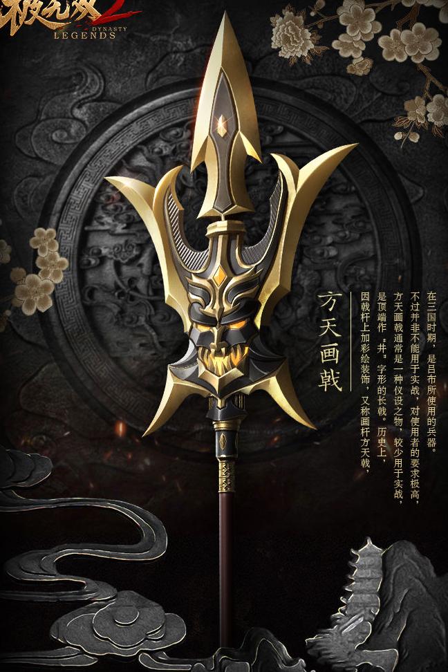 方天画戟是一种古代兵器,因戟杆绘有彩饰而得名画杆方天戟。它多用于仪仗,并非实战常见,但并非不能用于战斗,只是对使用者的技艺和力量要求极高,故实际应用较为罕见。